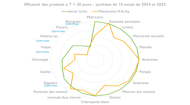 Cet essai illustre l’intérêt d’Iseran, notamment en tant que partenaire du DMTA-P. Par rapport aux produits à base de mésotrione seule, Iseran présente une efficacité plus élevée et une meilleure rémanence.